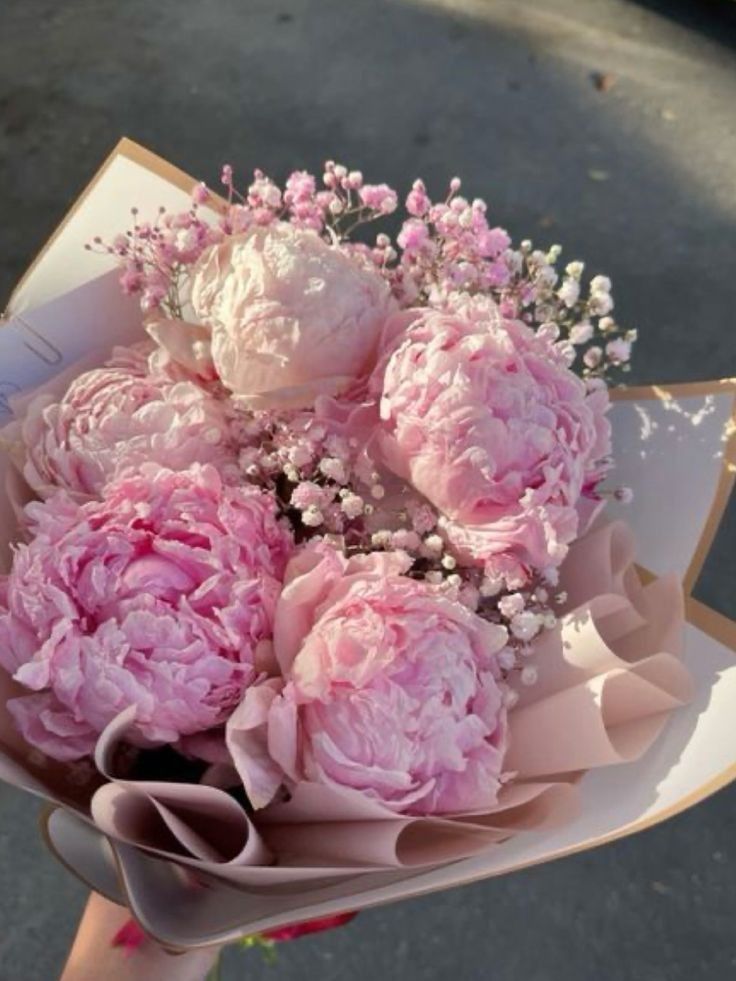 Découvrez un bouquet délicat composé de 5 peony rose clair, soigneusement arrangés dans un emballage simple et épuré.