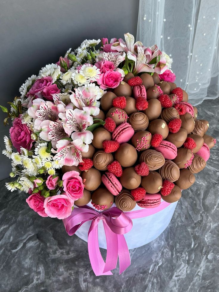 coffret fleurs diverse blanche ,rose et plante verte chocolat avec macaron a la fraise et bobon